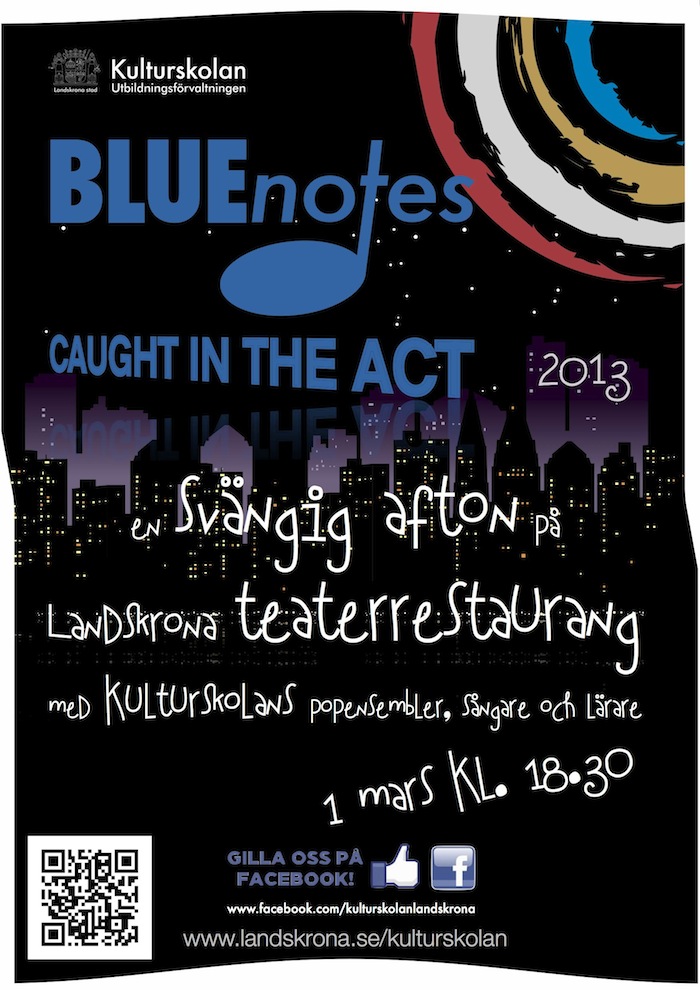 För femte året i rad arrangerar Kulturskolan i Landskrona ”Blue notes”. Fredag 1/3 kl.18.30 öppnar dörrarna till Landskrona teaterrestaurang. Kulturskolan mönstrar ett urval av olika popensembler och sångelever. Precis som tidigare år medverkar en mix av både aktiva och före detta elever som gått vidare i sin utveckling. Årets upplaga är en utveckling från jazzen till populärmusiken. Ett axplock av skolans musikpedagoger kommer också att gästa scenen.